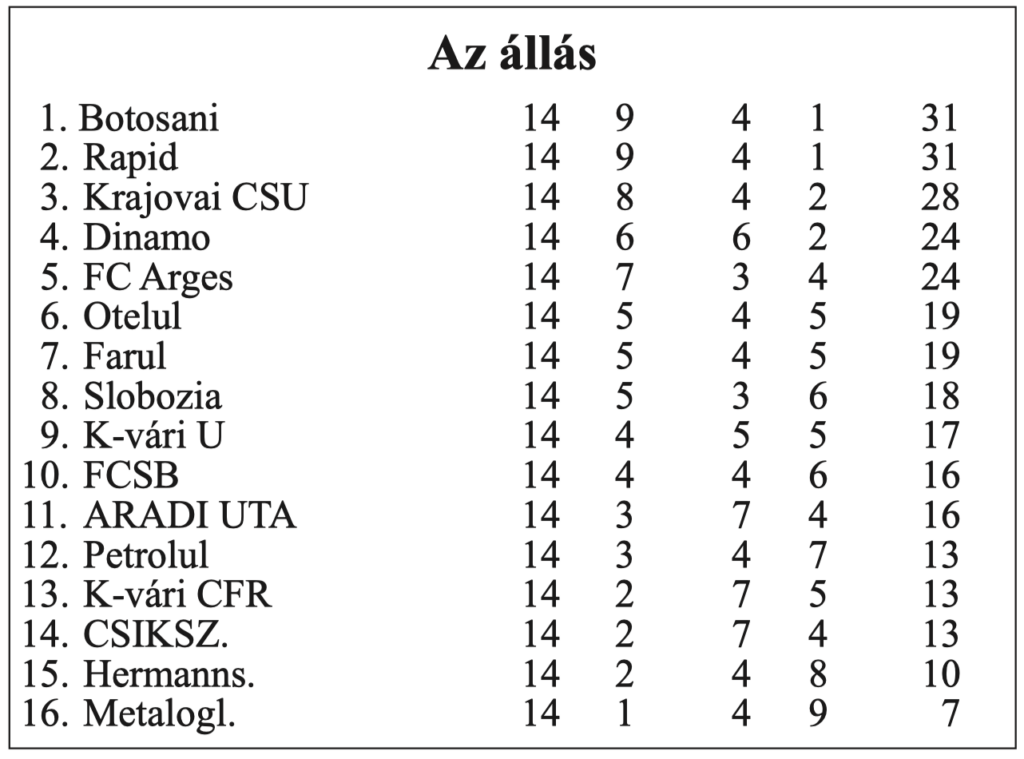 Az utóbbi forduló eredményei: CSÍKSZEREDA-Petrolul 1-1, FC Arges-Dinamo 1-1, Otelul-K-vári U 1-2, K-vári CFRFarul 0-2, Metaloglobus-Krajovai CSU 0-0, FCSB-ARADI UTA 4-0, Botosani-Hermannstadt 2-0, Rapid-Slobozia 4-1-