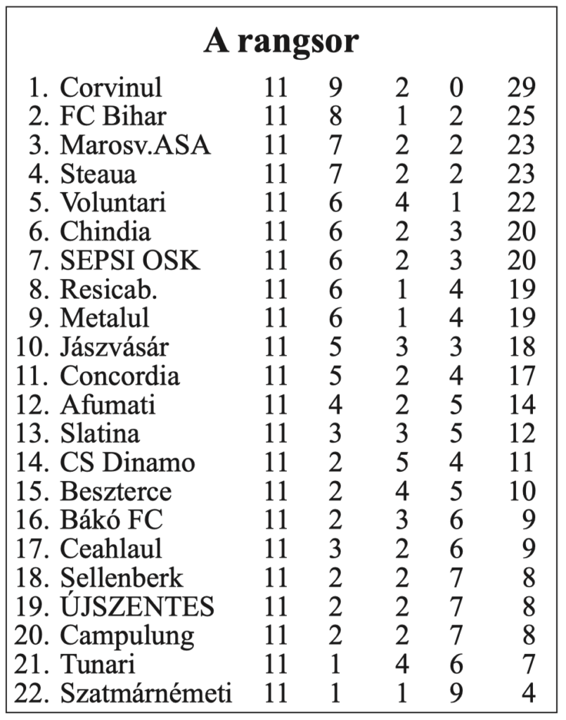 November 1 11,00 óra Ceahlaul-Szatmárnémeti, Tunari-Resicabánya, FC Bákó-Sellenberk, Buzau-Campulung, Besztercei Gloria-Corvinul, Slatina-Chindia, 12,30 óra Afumati-Marosv.ASA