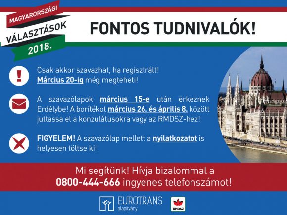 „A következő időszak arról szól, hogy segítsünk a voksolás folyamatában azoknak, akik regisztráltak” – fogalmazott a felhívás kapcsán Nagy Zoltán Levente, az Eurotrans Alapítvány elnöke. „Aki részt venne a választásokon, de még nem regisztrált, azt arra biztatjuk, hogy sürgősen tegye meg. Március 20-ig az RMDSZ helyi és az Eurotrans Alapítvány irodáiban kollégáink várják azokat, akik regisztrálni szeretnének. Bármilyen ezzel kapcsolatos kérdéssel hívják bizalommal a 0800-444-666 ingyenes telefonszámot” – mondta.
