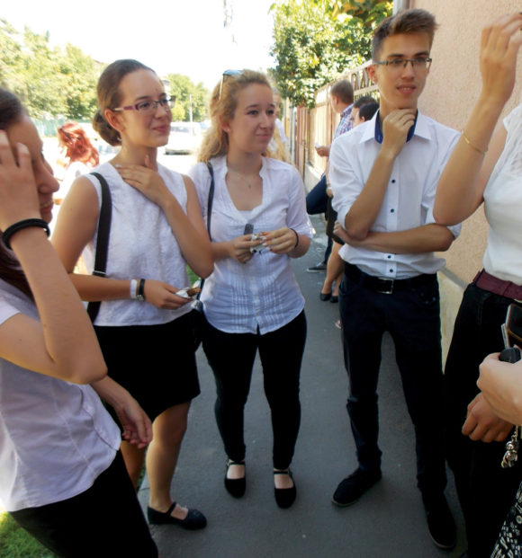 A magyar diákok az Élelmezési Szakkolégiumban létrehozott központban vizsgáztak, látogatásunk napján éppen a román írsábelin voltak túl a legtöbben. Az intézmény előtt fürtökben állva osztották meg egymással vizsga-élményüket az ünneplőbe öltözött fiatalok, általános a vélekedés, mely szerint a vártnál jóval könnyebbnek bizonyult az idei román írásbeli vizsga. Tételekről, ezek értelmezéséről folyik a vita, egyesek tizenegynéhány ívet teleírva tettek bizonyságot tudásukról, de az, aki a legkevesebbet tudott, az is teleírt hét ívet. Kiss Anitával, a Bartók Béla Elméleti Líceum TT osztályának végzősével találkozunk először, ő egyértelműen elvégezhetőnek tartja a vizsgatételeket, számára nem okozott különösebb gondot egyik sem, de megjegyzi, hogy a TT-n jóval többet foglalkoztak a kötelező vizsgatantárgyakkal, természetesen a román nyelv tanulására is nagyobb hangsúlyt fektettek. Mintha összebeszéltek volna, Szabó Anita és Franka Noémi egyszerre érkeznek, pedig külön termekben vizsgáztak. Széles mosolyukról egyértelműen látható, hogy nem teltek el hiábavalóan a líceumi évek. Berta Bianka és Gyenes Brigitta is könnyűnek találta a tételeket, remélik, hogy a teleírt tizenegynéhány oldal elegendő lesz a jó eredményhez. A vizsgadrukktól mentesült, jókedvű diákok között továbbra is izgul Szeles Andrea tanárnő, hiszen több diákja a viszonylag előrehaladott idő ellenére sem jelentkezett még. Elmondása szerint, számára is meglepetésnek bizonyultak a tételek, egyértelmű és érthető volt a megfogalmazásuk, és meggyőződése szerint, azok a diákok, akik legalább odafigyeltek és valamennyit hozzátanultak az anyaghoz, biztosan megszerzik az átmenő jegyet. A tanárnő természetesen arra számít, hogy a diákok közül románból a legtöbben a minimálisnál jobb osztályzatot szereznek. A vizsgát maguk mögött tudó diákok élénken vitatják meg a tételeket, idézetek, értelmezések, megoldások lehetőségei hangzanak el, közben kiderülnek teljesen vagy csak részlegesen elhibázott válaszok is. Egy-egy “ezt elszúrtam” kijelentésre elvonul egy-egy felhő a vidám társaság előtt, de nem sokáig, mert a következő tételek közül többet is teljes pontszámra méltónak találják. A hangulat mindenképpen inkább bizakodóbb. A csoportban mindenki továbbtanulásra készül. A sikeres érettségit követően, ősztől legtöbbük valamely temesvári egyetemen folytatná, készülnek Nagyváradra és Kolozsvárra is. Van, aki Budapesten fogja kiteljesíteni tanulmányait. A fiúk általában a Műegyetemre készülnek, a mechatronika és AC (számítástechnika és automatizálás szak) –szakokra vágynak, a megkérdezett lányok esetében az újságírás, építészet, informatika és gazdaságinformatika szakok kerültek szóba. Az idei érettségizőkkel együtt reménykedünk a további sikerükben, és bízunk abban, hogy a felsőfokú képzésüket követően, idehaza ismét találkozhatunk velük.