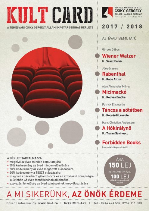 A 2014/2015-ös évadban útjára indított kezdemé­nye­zés rendkívülisége abban rejlik, hogy a más, hagyo­mányos színházbérletekkel szemben a KULT Card az évad minden előadására érvényes kedvezményeket kínál. A temesvári színház bérlete nem csak az évad új bemutatóira biztosít garantált belépést, de a KULT Card tulajdonosok fél áron tekinthetnek meg minden más, az évadban műsorra kerülő saját, valamint vendégelőadást, beleértve a Temesvári Eurorégiós Színházi Találkozó előadásait is, melyekre jegyet illetve bérletet is fél áron válthatnak. Mindemellett a színház bérletesei díszven­dégként vehetnek részt az évad végi gálaműsoron, mely 2018-ban, a színház fennállásának 65. évfordulója alkal­mával kerül megrendezésre, és szavazataikkal ők dönt­he­tik el, ki kapja meg idén a legjobb színésznek és szí­nésznőnek járó díjat.