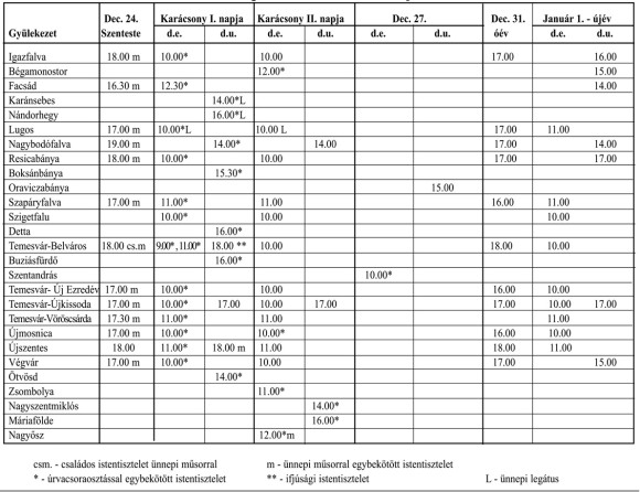 A Temesvári Református Egyházmegye gyülekezeteinek ünnepi istentiszteleti rendje