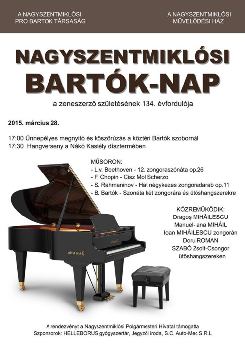 A nagyszentmiklósi Pro Bartók Társaság és a Művelődési Ház 2015. március 28-án, szombaton Bartók-napot szervez.