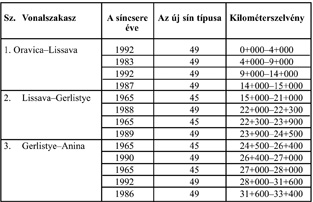 1965-től kezdődően a C.F.R. Temesvári Tartományi Igazgatósága (Direcția Regională de Căi Ferate Timișoara) síncserét hajtott végre a teljes vonalon: 40, 45 és 49 kilogrammos síntípusokkal váltották ki a XX. század elején a MÁV által lefektetett síneket. A táblázat a síncserék adatait foglalja össze (Radu Bellu kimutatása alapján).