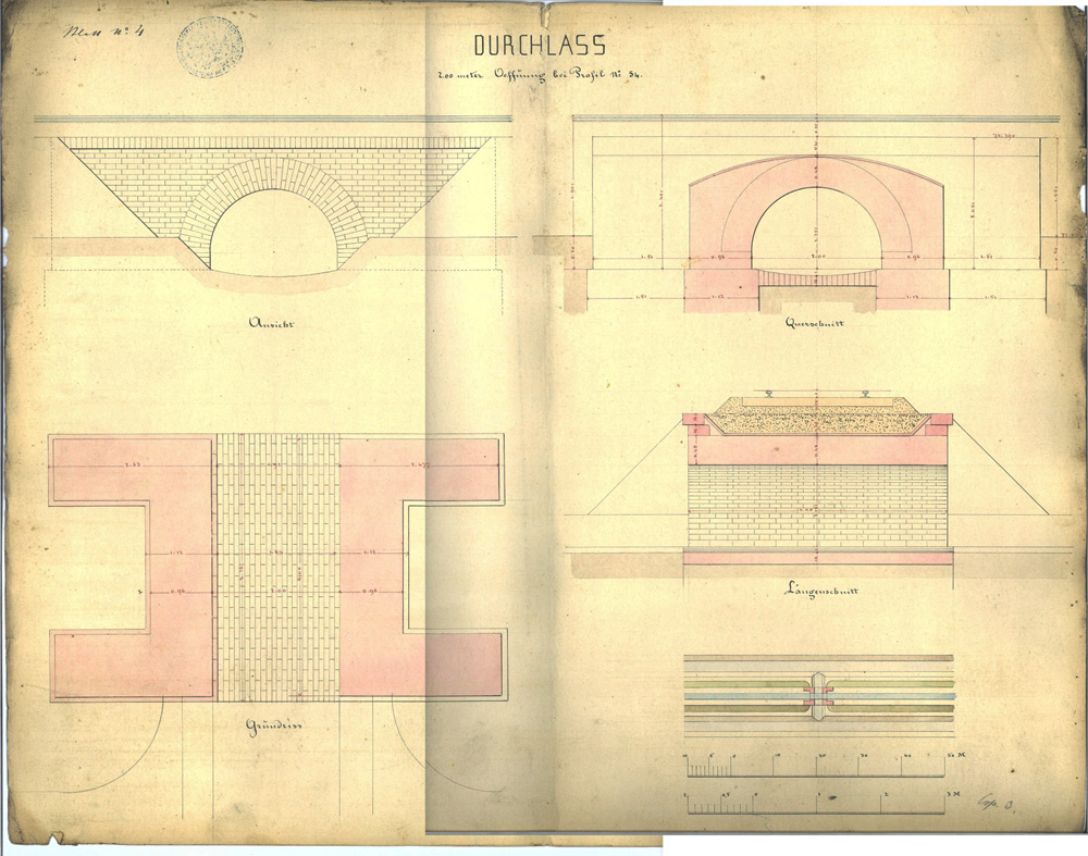 Maguk a tervrajzok nemcsak igényesek, hanem pontosak, sallangmentesek, csak a legszükségesebb tennivalókat tükrözik, bármely mesterember kiigazodhatott rajtuk. A MÁV Archívuma őriz egynéhányat. Terjedelmi okokból azonban itt csak egy két méter nyílású boltozott áteresz tervét közöljük.