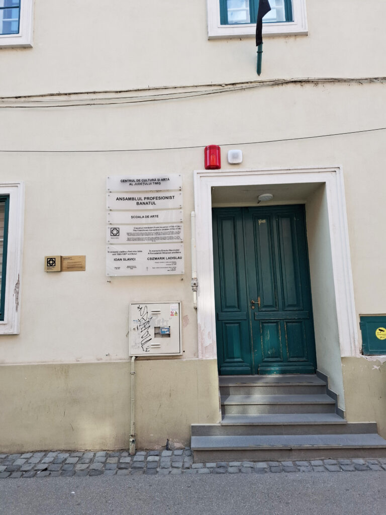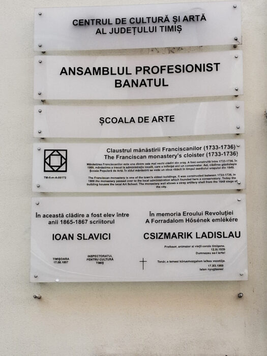 “Magyar lennék, de rommagyar vagyok, /ha megvágom magam véletlenül,/emléktáblák ömlenek belőlem,/szobortalapzatok és felavatások/”Demény Péter: Haza-szvit című verséből származnak e sorok, a 18 évvel ezelőtt megjelent költemény fájdalmas igazságokat fogalmaz meg, amelyek semmit sem vesztettek hitelükből. Kisebbségi létünk egyik sajátossága, hogy védjük, őrizzük, erősítjük identitásunkat, ennek egyik módja az emléktáblaállítás, így jelezzük, hogy voltunk, vagyunk, leszünk. Ioan Slavici jelentős író, valóban két évig az ebben az épületben működő piarista iskolában tanult, az emléktáblát, amely ezt a tényt rögzíti, 1997-ben helyezte el az épületen a Temes megyei Művelődési Hatóság. Vajon ők mit szólnak ahhoz, hogy a felújítás során az eredeti emléktábla eltűnt? A cégtáblaszerű emléktábla másik felén kétnyelvű szöveg olvasható, amely a temesvári forradalom mártírjának, Csizmarik Lászlónak állít emléket. Ebből nem derül ki, hogy ki állította, de a Ladislau név miatt azt hiszem, hogy nem magyar személy vagy szervezet. A szöveg nem a legjobb, hiszen csak annyit tudunk meg, hogy a forradalom hőse és a kórusmozgalom lelkes vezetője volt, halálának dátumából, 1989. XII.17. kellene kikövetkeztetnünk a történteket, ami azoknak, akik ezeknek az eseményeknek nem voltak tanúi, nem könnyű feladat. Ennek ellenére azt hiszem, hogy a temesvári forradalom hősének emléke minden temesvári lakosnak vagy idelátogatónak egyaránt fontos, megkérdőjelezhetetlen érték, olyan figyelmeztető emlékjel, amely mindannyiunké, ezért a kettő az egyben álemléktábla elfogadhatatlan, hiszen Ioan Slavici és Csizmarik László emlékét egyaránt sérti. Érdekes, hogy ez a temesvári forradalom 35. évfordulóján sem tűnt fel senkinek.