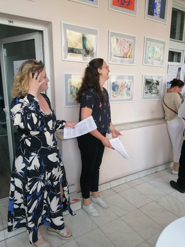 A közszemlére állított anyagot, az alkotói folyamat részleteiről, meggyőződésekről a két művész beszélt, bemutatva egymás alkotásait saját, egyéni meglátásait, az alkotások rájuk gyakorolt benyomásait, üzeneteit tolmácsolva a közönségnek. “ Legalább két kérdés mindig ott van: miért alkotunk, és hogyan alkotunk. Amikor alkotunk, valamilyen témákra, gondolatokra felhívjuk a közönség figyelmét, és ezáltal a közönséggel létrejön egy kapcsolat, egy közös gondolat, esetleg egy ellenérv, ami visszavezet az alkotóhoz. Feloldódunk, és vonalak születnek, felszabadulunk, és jelen vannak az erőteljes színek” – mondta Peres Makai Mercédesz. Fodor Zsuzsanna munkáit bemutatva kiemlte, hogy “ … a munkák kiemelik, mennyire fontosak a vázlatok, a tanulmányok, érezhető, hogy nemcsak a munka a lényeg, hanem sokszor maga az út, amit megteszünk az alkotásig. (…) Három fő témában alkotott Zsuzsi, az elsők Braque francia festő csendélete alapján készült tanulmányok, és ezek a színtanulmányok megtalálhatók Zsuzsi önarcképeiben is, ahol nagyon fontos a színek mennyisége, erőssége, és nem utolsósorban a harmóniája. Jönnek az absztrakt alkotások, ahol a ritmus és a dinamika jön képbe, nagyon jól látjuk, hogy mennyire jól tetten lehet érni a zenei ritmust a képzőművészeti alkotásokban.” – fogalmazta meg a művész.