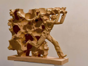 úgy anyaghasználati vagy mint téma, de problémamegközelítés szempontból is. A kisplasztika indította el tulajdonképpen az absztrakt szobor gon­dolatát, amiben nagy szerep jutott az új anyagok használatának. A festészettől átvett nonfiguratív variáns hozott be új anyagokat a szobrászatba, az addigi alapvető anyagok mellett, mint a kő, fa, bronz, más anyagok is bekerültek, különböző műanyagok, s a fémek sem csupán mint öntött bronz, hanem drót, rúd, lemez netán valami más rendeltetésre gyártott alkatrész felhasználásával. A fa esetében is lehet egy gally, deszka, léc, vagy hulladék, amit új rendszer szerint állítunk össze. Ezzel újabb lehetőségek nyíltak. Ehhez jelentős mér­- tékben hozzájárult a Budapesten a hatvanas évektől egészen a kilenc­ve­nes évek közepéig kétévenként szervezett nemzetközi kisplasztikai bien­ná­lé, amely bemutatta az egész világ kis­plasztikai törekvéseit. Hasonló jelentőségű volt a ravennai Dantesca kis­- plasztikai biennálé. Ezek a nemzetközi kiállítások ösztönzőek voltak nemcsak nekem, sok más szobrász szá­mára is. Hatásukra indult be a hetvenes évek végétől nálunk is a kisplasztikai kiállítások szervezése, először Bukarestben, majd Aradon, ahonnan szintén díjat hoztam el, akárcsak Ravennából a romániai csoporttal Dantescaról.
