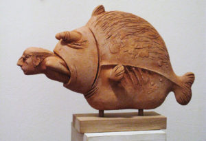 mint a fuvolázó flótás, vagy más halas ábrázolás az általa leg­inkább kedvelt terrakotta anyag zseniális meg­­mun­­ká­­lá­-sában.