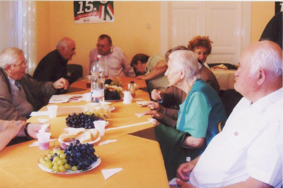 Nem volt hangzatos az ünneplés, inkább szerénynek, családiasnak mondható, ahol egymásért, egymásnak akartak néhány kellemes órát szerezni az egybegyűltek. Az alkalomra való felkészülés persze munkával járt, de a nehezét vállalók élén ott állt az elnökasszony, mellette pedig Varga Pál és Mária, Benkő József és Borbála, Kókai Antal és Maltring Brigitta, és nekik köszönhetően a klub termébe beköltözött a verőfényes ősz: az asztalokon szemet gyönyörködtető szőlőfürtök, hófehér lágy kenyér, kisorsolásra váró díszes kosár, nemzeti színű szalaggal átkötött üveg, benne rubinvörös nedű – a természet jelképes ajándéka. Származását tekintve pedig rékási szőlő, rékási bor, rékási kenyér – ajánlotta Manyi az ünneplők figyelmébe. A klub női tagjai emellett egyéb harapnivalóról is gondoskodtak, mert mint általában máskor, háziasszonyi mivoltukat ezúttal sem tudták megtagadni. Kísérő dalt a Bartók kórusból hoztak: Megérett, megérett a fekete szőlő.
