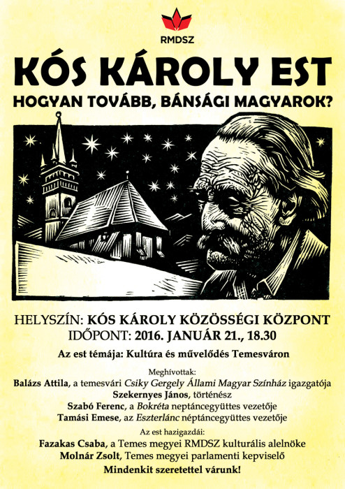 Közös jövőnk kialakítása céljából a Temes megyei RMDSZ 2016-ban Kós Károly Estek címszó alatt beszélgetés-sorozatot indít, mely által a magyarság minden tagja bekapcsolódhat a közös jövőnk megtervezésébe. A Temesváron született Kós Károly szellemiségében megtartandó beszélgetéssorozat olyan konkrét helyzetekre kíván rávilágítani, amelyek sajátos jellemzői a bánsági magyar közösségnek, és ezen jellemzők mentén próbál megoldásokat megfogalmazni a magyar közösség jövőjét illetően. Az első ilyen jellegű beszélgetést jövő csütörtökön, január 21-én 18,30 órai kezdettel, a Magyar Kultúra Napja alkalmából szervezzük meg Temesváron, a Kós Károly Közösségi Központban (Putna utca 7. szám). A kulturális témájú közvitán Balázs Attila, a Temesvári Csiky Gergely Magyar Állami Színház igazgatója, Szekernyés János helytörténész, Szabó Ferenc, a Bokréta néptánccsoport vezetője, valamint Tamási Emese, az Eszterlánc néptánccsoport vezetője, Fazakas Csaba református esperes, az RMDSZ művelődési alelnökének és Molnár Zsolt parlamenti képviselő moderálásával a temesvári magyar kulturális élet helyzetéről beszélgetnek.
