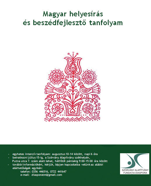 A Temesvári Szórvány Alapítvány egyhetes, intenzív magyar helyesírás és beszédfejlesztő tanfolyamot szervez augusztus 10–14. között, napi 6 órában. A tanfolyam Bakó Ágnes, a Bartók Béla Elméleti Líceum pedagógusának irányításával zajlik, és azoknak ajánlják, akik már rendelkeznek bizonyos szókinccsel, beszélik is a nyelvet, de nem biztosak a nyelvtani szerkezetek használatában. A tanfolyam főleg a szövegalkotásra, helyesírásra és a központozásra (pont, vessző, kérdőjel stb. használata) összpontosít. Beiratkozni július 15-ig lehet, a Szórvány Alapítvány székhelyén (Putna utca 7.).