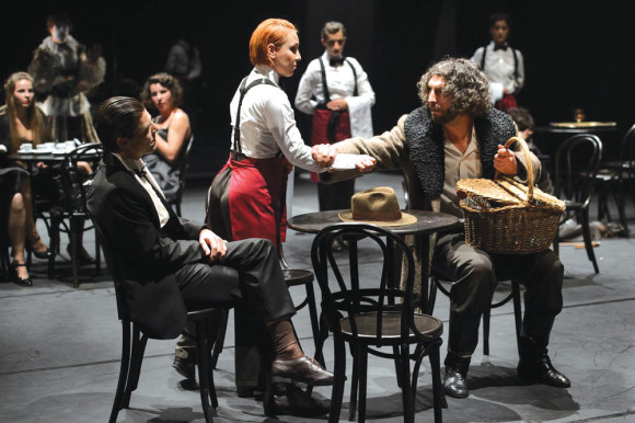 Az Eurothalia Fesztivál kere­tében bemutatott, a Csiky Gergely Állami Magyar Színház és az Allami Német Színház közös, Silviu Purcărete világhírű rendező által színre vitt Moliendo Café című, non verbális produkcióját beharangozó szövegben olvas­hat­juk ennek „középpontjában a kávé fogalma, eszenciája, története, kul­túrája, illata, színe és íze áll, egy olyan rendezői koncepció által összefogva, “előadássá formál­va”, amely a színház és a színész játék legősibb és legösztönösebb formáját használja alapul.” És a néző meggyőződhetett, hogy igen­is minden a legnagyobb rendben van a kávé körül, már a legelső jelenetben életet oltanak ki érte vagy miatta, talán rituális áldozat bemutatása történik a színpadon, esetleg mai világunk erőszakos vol­tára kívánják felhívni a fi­gyel­met. Mindenesetre kellően gro­teszk és sok “vérrel” járó a nem eurokonform disznóvágásra em­lékeztető jelenet. Kávés környe­zet­ben kissé furcsán hat, de visz­szatér még a sertés motívuma, adott pillanatban hárman is vi­selnek sertésmaszkot és ennek meg­felelően viselkednek a szín­padon. Erőszak, nyilvánvaló rossz­indulat jellemzi a jelenetet. Ugyanakkor Silviu Purcărete já­ték­ba kezd, és a humor sokféle vál­tozata végigkíséri az előadást. A továbbiakban kísérletet tesznek a kávéfogyasztás freskójának meg­festésére. Ahány szín, annyi, sokszor életszerű társadalombí­rá­lat, máskor valószerűtlen, helyen­ként a tartalmat nélkülöző for­mák­ra emlékeztető, néha közhelyes, máskor sokféleképpen értelmez­he­tő jelenet követi egymást. A néző saját intellektusához, temperamen­tu­má­hoz, kávé-, élet-, vagy szín­ház­fogyasztási szokásához mérten, ahogy tetszik, értelmezheti ezeket. A kávéfogyasztás elterjedését meg­előző időkben a pizsama-sze­rű egyenruhafélékben mindenki egyformán bóbiskol, összecsuklik, álmatag és ingerszegény. Vagy be­teg? Esetleg is-is. Nem sokáig, mert színrelépnek a kávéfogyasz­tás szerelmesei, rabjai – mindenki a maga módján fogyasztja a fe­ketét, ugyanakkor van helye a di­verzitásnak is, a rendületlenül ti­ra­misut rendelő, a boldog béke­idő­ket megidéző alak képében. Ala­posan meg is “szenved” kitartása miatt. Precíz és félreérthetetlen módon megfogalmazott jelentést kap a “felmenni egy kávéra” ki­fejezés, kimondva avagy kimon­dat­lanul általában mindenki ugyan­arra gondol, amikor eleget tesz a meghívásnak, végül is a­hogy tetszik, a korlátokat minden­ki maga szabja meg. Közben foko­zó­dik a helyzet, gyűlnek a fellegek a kávéház illatos egén, a plety­ka­fészkek, a kávéházban ismer­ke­dők, találkozgató szerelmesek, illetve a kávéházban megvesz­te­getési akciót lebonyolítók – a né­hány évvel ezelőtti kolbászos-hur­kás megvesztegetési ügyre emlé­keztetve a képzeletbeli kávéasztal mellől egyúttal ítéletet mond a rendező korunk korrupcióval telí­tett világára – helyét átveszi a felelős vagy kevésbé felelős eb­tulajdonosok népes tábora, a jelenet fricskának is értelmezhető azok számlájára, akik státusuk ki­emelése érdekében, holmi kellék­ként tartanak maguk mellett egy-két, netán három ebet. A kávéházi jelenetekben e szocializációs hely­színek jellegzetes figurái is sze­repet kapnak: az okos­telefonjába belefeledkezett fiatal, aki bármi is történik körülötte rendületlenül pötyögtet. Majd előjön a modern technikát ellenző, anarchistaként viselkedő úriember is, és az egy-egy züllött éjszakát követően, a “gatyáját” is szó szerint a kávé­ház­ban hagyó életművész, a kicsa­pon­gók csapata szintén megjelenik, akik a kávé élénkítő hatására utaz­nak. A közönség meg képzeletbeli utazásra indul, orosz kávézási szo­kások harsány bemutatása követ­ke­zik, fegyveres anarchisták ga­ráz­dálkodnak, mindenesetre a hó­vihar képi és hanghatása meglehe­tősen hiteles. Itt jegyezzük meg, hogy az előadást végigkísérő hang­hatások Vasile Sirli kitűnő munkáját dicsérik. A forgatagban megjelenik egy utazásra felkészült menyasszony is, valahonnan is­me­rős az alakja – ő nem kávézik, vagy talán mégis? – viszont a boldogító igent követően eldobott csokra megszerzésére kis cse­te­paté alakul ki a kávéházi kurti­zá­nok között… Naná, hogy menten férjhezmennének. A közönség “to­vábbutazik”, angolszász területen látható, hogy másként kávéznak, mindeki éppen “happy”, van bő­ven ital, ittas és kabaré, smucig vöröshajú skótok, talán írek, meg Dukász Péter szakállas nőalakban. Ama Concita óta semmin sem kell csodálkozni. Az említett disznó­fe­jűek is itt kerülnek képbe, és disz­nólkodásuk után, kolbász, hurka formájában tálcára. Utána rögtön a kitűnő kotyogó látványára dob­ban­hat meg a szíve mindenkinek, aki legalább egyszer életében él­vezte a kis fémből készült ká­véfőző alkalmatosság “termését”. És mindezekután a kávé a meny­nyekbe megy. Szószerint. Piedesz­tálra állítódik és mindenki a leg­teljesebb áhítattal juttatja kife­je­zésre végtelen, mindent elsöprő, monumentális hódolatát iránta.