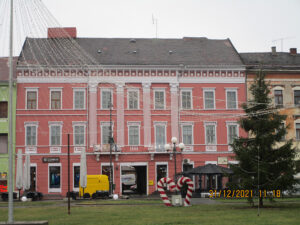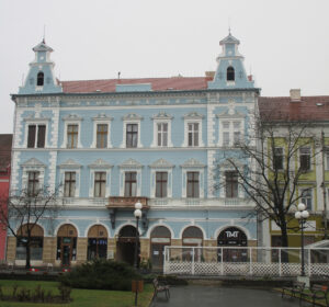 A másik, halványkékre átfestett épületet az egykori városháza helyén emelték. Kapualjában ott voltak az emléktáblák, amelyek az 1849-es februári harcokról, illetve Kossuth Lajos aradi tartózkodásáról emlékeztek meg. 1920 után távolították el őket.