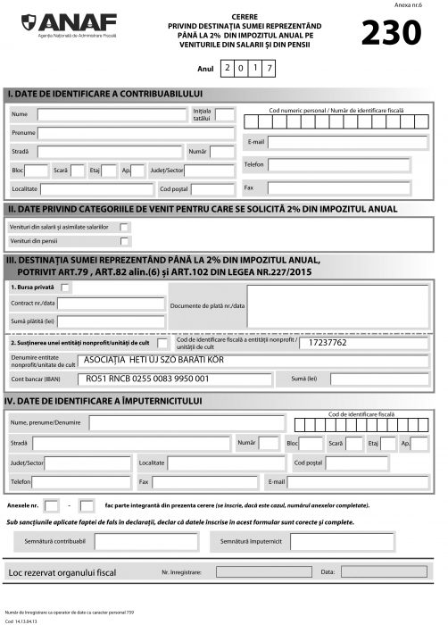 A 230-as számú űrlap letölthető az adóhivatal honlapjáról (www.anaf.ro) is, és közvetlenül eljuttatható az Agenția Natională de Administrare Financiară címére ANAF TIMIS Str. Gheorghe Lazăr, nr. 9B, Timișoara, cod: 300081, județul Timiș legkésőbb május 25-ig. Ebben az esetben a felajánló kitölti a III. rovat 2-es pontját is (Susținere unei entități nonprofit) a Baráti Kör adataival: Cod de identificare fiscală: 17237762, Denumire entitate nonprofit: ASOCIAȚIA HETI ÚJ SZÓ BARÁTI KÖR, cont bancar (IBAN): RO51 RNCB 0255 0083 9950 0001.
