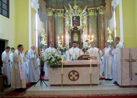 Román nyelven ft. Hiticas Valentin Macedon segédlelkész, németül ft. Kocsik Zoltán spirituális, a piarista templom igazgatója osztotta meg Kisboldogasszony-napi gondolatait az egybegyűltekkel.