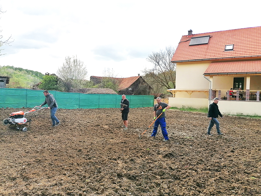 Mátéfi Zsolt, tájépítész és tereprendező kollégáival éppen az udvar füvesítésén dolgoznak. Elmondása szerint gyermekkorában maga is táborozott Zoldon, maradandó emlékekkel gyarapodott a táborozás alatt. Most örömmel segít újjávarázsolni a táborhely tágas udvarát, azzal a reménységgel, hogy a később megérkező gyermekek örömmel játszanak a füves udvaron.