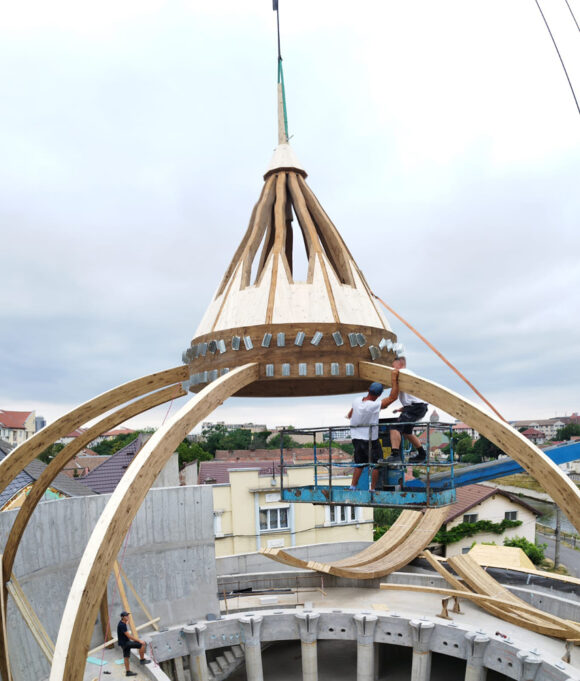 Újabb mérföldkőhöz érkezett az Új Ezredév Református Központ építése. A vejtei Tehnica Schweiz cég szakemberei – akik a monumentális templomépület tetőszerkezetét is megvalósították – szerdán elhelyezték az építés alatt álló konferenciaépület tetőszerkezetének tartóelemeit és a konferenciaterem belső kupoláját.