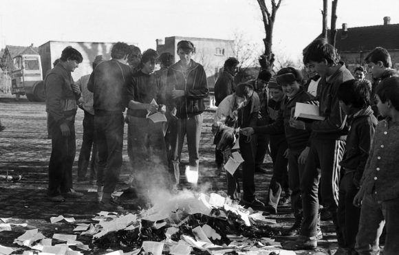 A felvételen egy csoport fiatal, akiket nem sikerült megmételyezni a Ceausescu-féle propagandával, a községi könyvtárból kidobott kommunista hazugságokat tartalmazó brosúrákat, könyveket égetett a piactéren. A falurombolás hírére, a Cahu- zac-sur-Vere-i dél-franciaországi község is felfigyelt, és védelmébe vette a falut. Ennek köszönhetően mindjárt a forradalom győzelme utáni első napokban ide irányított segélyek érkeztek, közöttük Németországból is. Ám a község lakói, az akkori szegénység ellenére, maguk is összefogtak, adományokat gyűjtöttek a rászoruló családok részére.