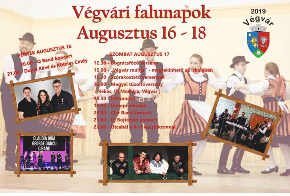 Ezen kívül a VÉGVÁRI FALUNAPOK háromnapos rendezvénnyel várja a község lakóit, az elszármazottakat és a látogatókat. A tervezett programok: pénteken, augusztus 16-án 20 órakor – Q Band koncert, 21 órakor – Dupla KáVé és Köteles Cindy. A műsor után közönségtalálkozó, dedikáltatási és fotózási lehetőség. Szombaton, augusztus 17-én 12,30 órakor bográcsosfőző verseny, 15 órakor – kiállítás megnyitója: Végvár múltja – megtekinthető az iskolában, 15,30 órától szórakoztató versenyek, 16 órakor veszi kezdetét a megyei tűzoltóverseny (résztvevők: Temesrékas, Újmosnica, Végvár), 18,30 órakor felvonulás, 19 órakor ünnepi előadás, 20 órakor Clar Band koncert, 21 órakor Új Bojtorján koncert, 22 órakor kezdődik az utcabál a 4+2 Asszinkronnal. Vasárnap, augusztus 18-án délelőtt a református templomban istentisztelet keretében ünnepi megemlékezést tartanak a község 225 évvel ezelőtti telepítésének évfordulója alkalmából. 18 órától utcabállal zárul az idei Végvári Napok rendezvénysorozata.